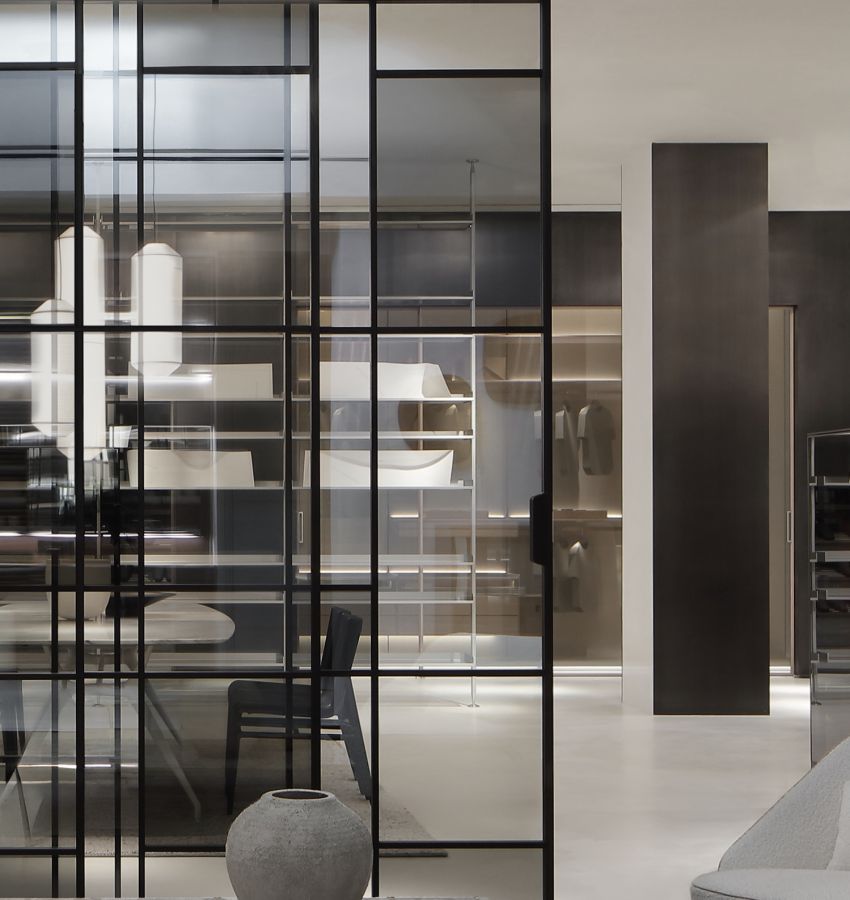 Rimadesio представляет новые модификации системы Air. К существующим распашным дверям добавились два варианта: сдвижное полотно, перемещающееся по алюминиевой направляющей Rimadesio, и система Syncro с механизмом синхронного движения всех панелей.