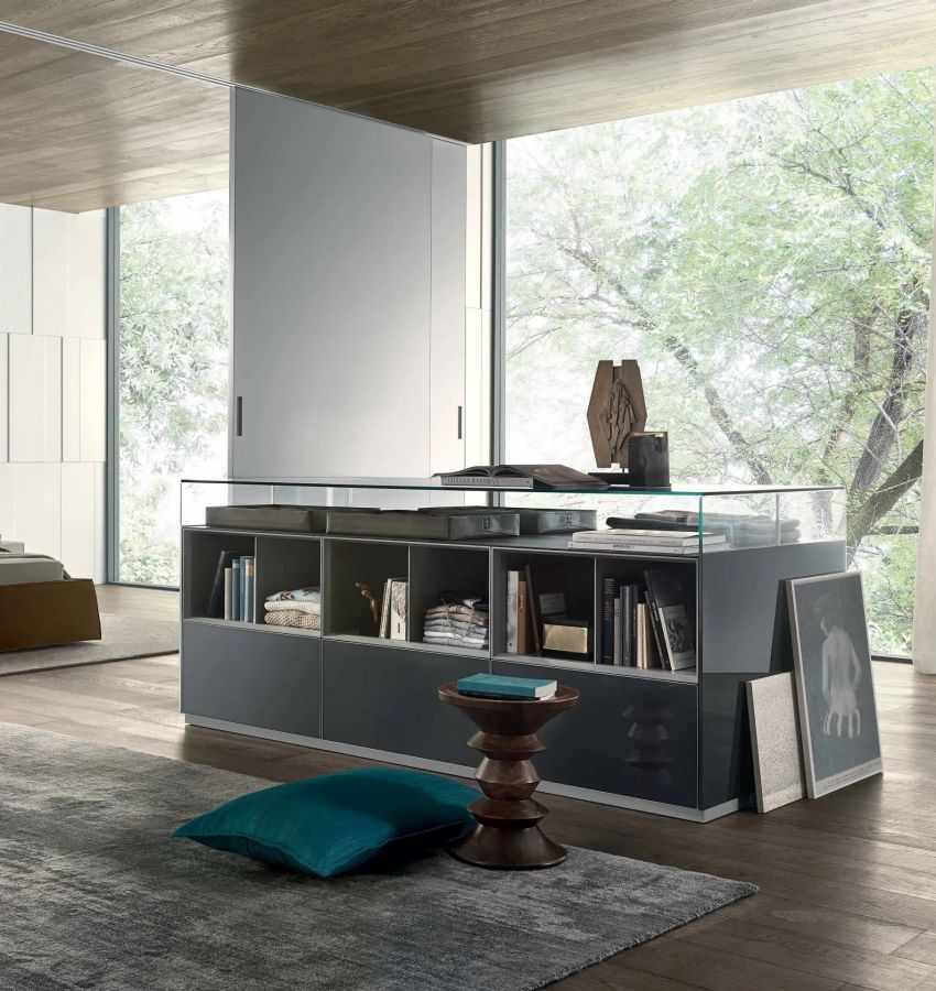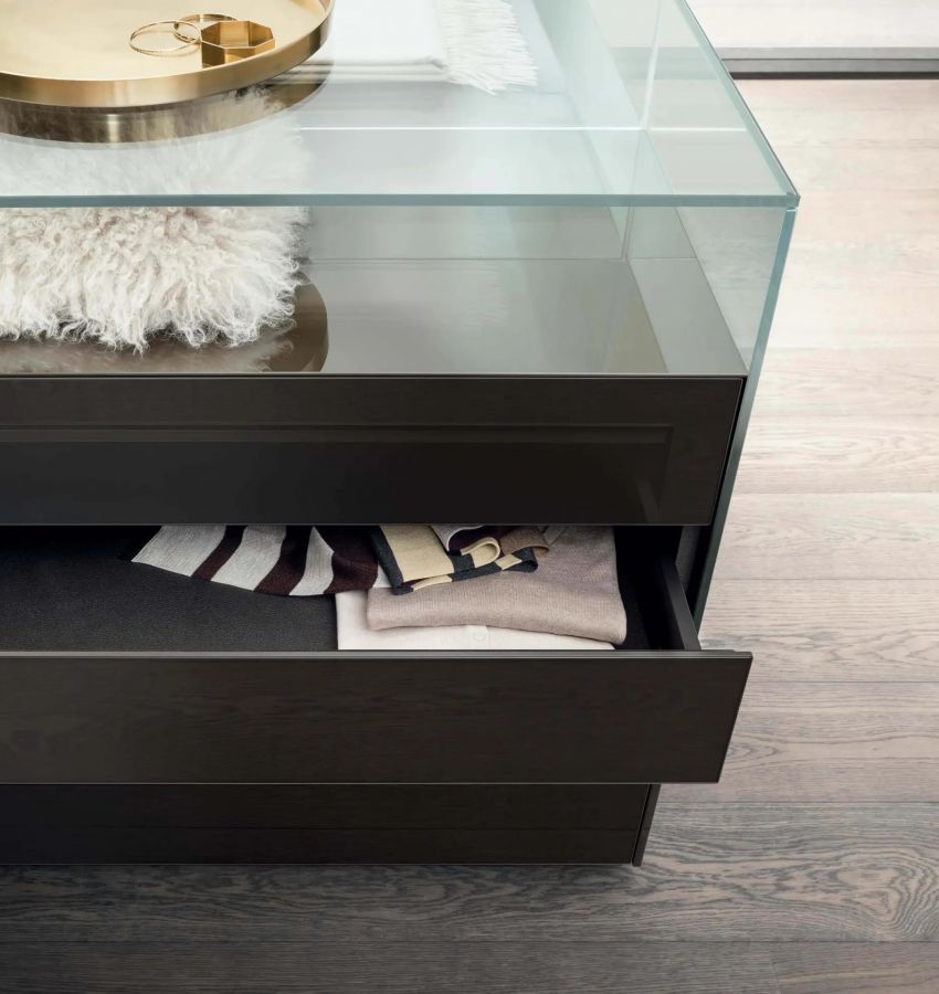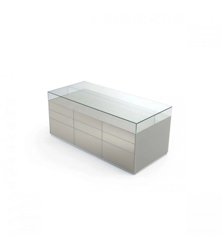 Система двусторонних модулей для хранения доступна в различных размерах. Она подходит и для домашних интерьеров (в частности, для использования в гардеробных), и для общественных мест (например, торговых залов). Верхняя часть модулей изготовлена из прозрачного стекла, боковины выполнены из окрашенного стекла. В системах Dolmen чередуются ящики с тач-механизмом открывания и лакированные открытые секции.