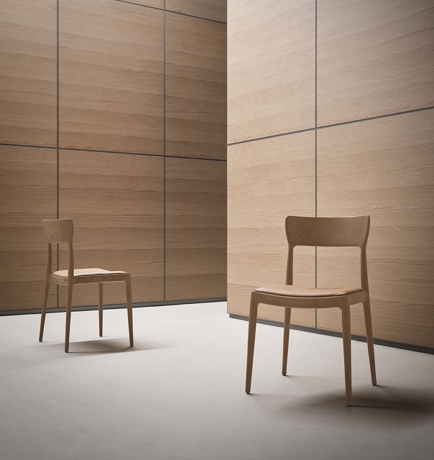 В стуле Sophis целостность формы сочетается с точностью исполнения. Акцент сделан на чистых линиях каркаса, удобной крупной спинке и продуманных узлах крепления. Модель предлагает вариативность: для каркаса — светлый, термообработанный или черный дуб; для сиденья — ткань или кожа. Эта система отделок придает стулу индивидуальность, позволяя вписать его в разные пространственные контексты.